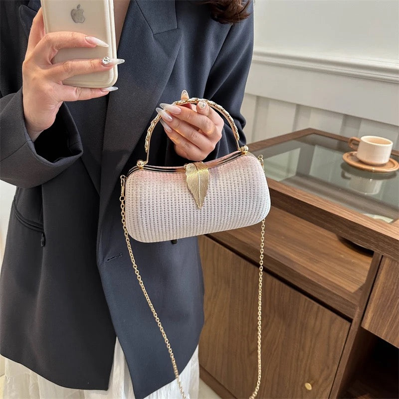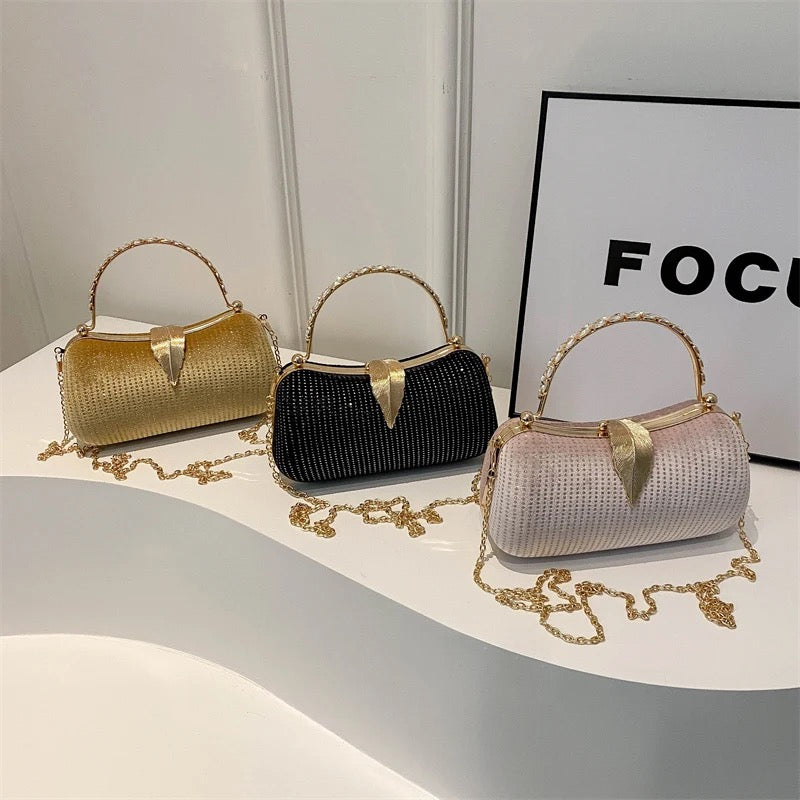 This stylish clutch bag features a shimmering metallic finish and a unique studded pattern. Its compact size and versatile design make it perfect for both day and evening wear.